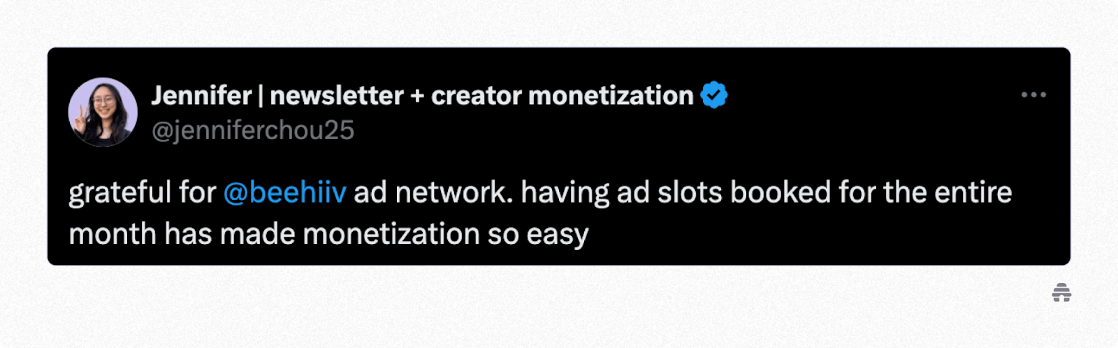 "The ad network... it works on autopilot. One time a lot of people clicked on a B2B ad that paid two dollars per click. So I made $600 from that one email, and that was from the beehiiv ad network."