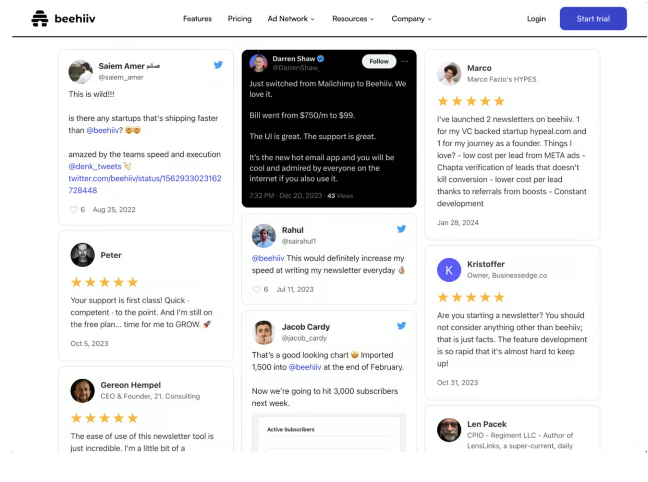 He shared, “Huge shout out to the whole beehiiv team. It must be so hard to build out a platform like this in an already crowded space. And I love your angle. I love that you tap into the creator market and I am super stoked to follow you guys along and help you guys out.”