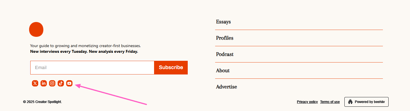 At the bottom of each post, the footer includes icons that link to your social media accounts (if added). These links help readers connect with you and explore more about your publication.