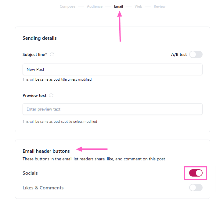 By default, this feature is enabled in the Email page settings of your post. If you prefer to disable social sharing icons for your email post, follow these steps:
