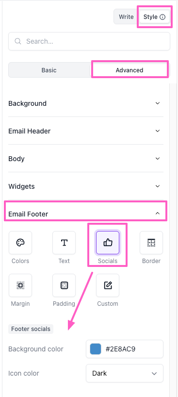 - The Background section will be expanded by default. Collapse it, then open the Email Footer section. Click on the Socials icon to reveal styling options.