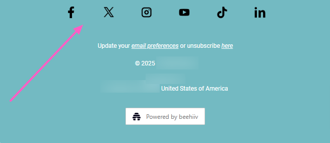 In a typical beehiiv post, social links can appear in 3 locations: