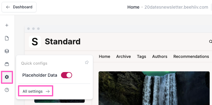 - The Website Builder will open with a preview of your site on the canvas. From the left panel icons menu, click on the Settings icon, then click All settings.