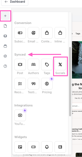 - In the left panel, scroll down to Synced, and select the Socials block. Then drag and drop the element to the desired location on your website canvas.