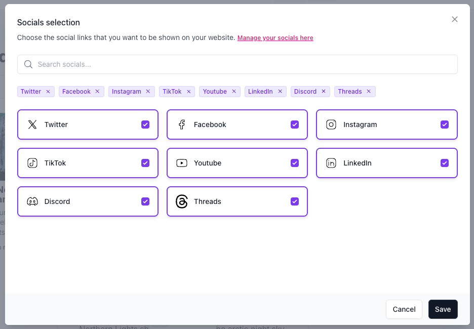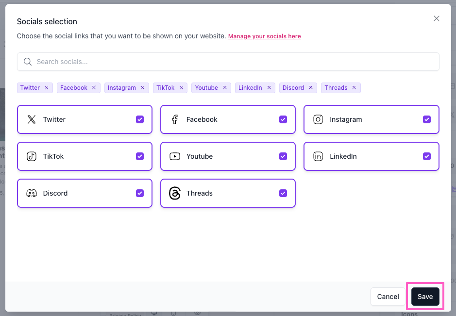 The Socials selection modal will open. Check the boxes next to the platforms you want to include, or leave them all checked.