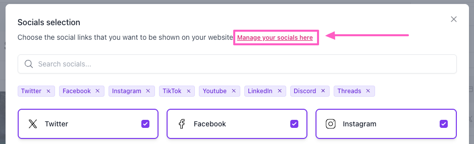 Tech Note: You may see additional icons while editing, but only the social links you've added in your settings will appear on the live site. - (Optional) To update your social media URLs, click the Manage your socials here link in the Socials selection modal.