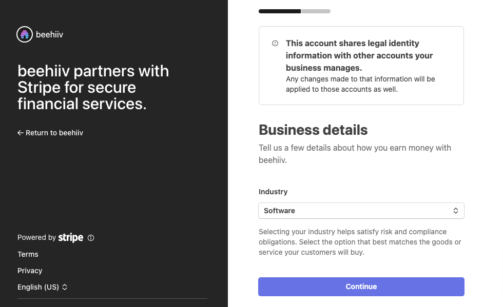 Reminder: The account that you use for paid subscriptions and digital products is separate from the publication-specific Stripe Express account that you create for the Boosts Marketplace or Ad Network. For info on other Stripe accounts you may encounter on beehiiv, please refer to our overview article explaining types of Stripe accounts.