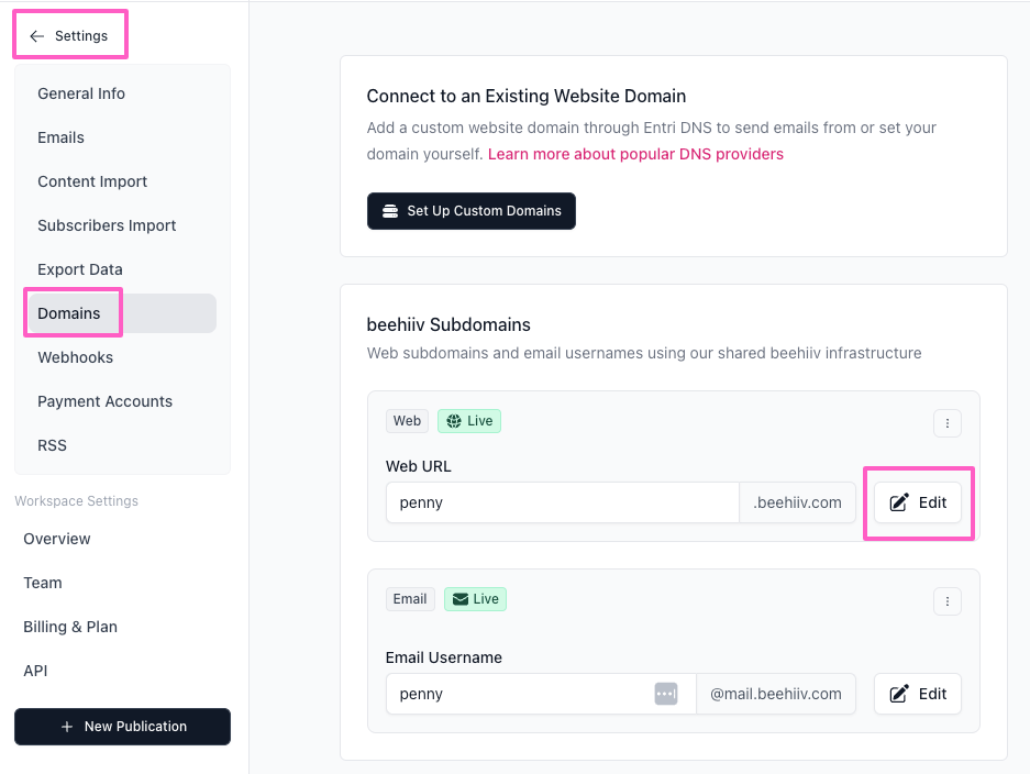 - Alternatively, you can customize your beehiiv subdomain by going to Settings > Domains, click Edit under Web URL, make your changes and click Confirm to save them automatically.