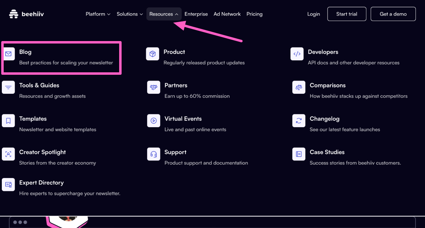 Linking your beehiiv site with another website is an excellent way to drive traffic and create a seamless browsing experience for your audience. For example, on beehiiv.com under Resources, you'll find links to our Blog and other external sites.