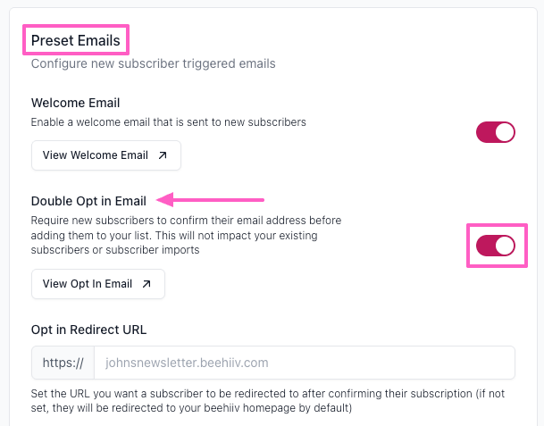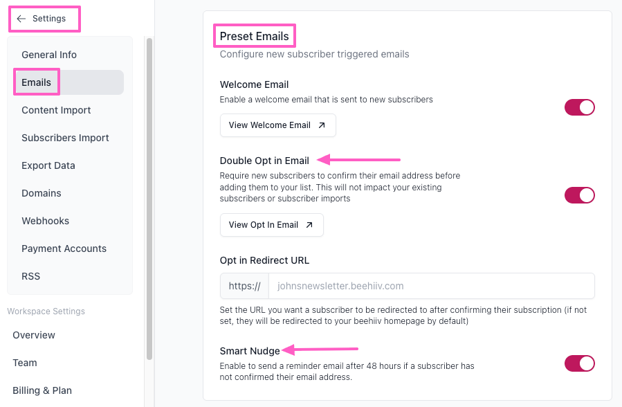 Double opt-in and Smart Nudge are two features that work together to help you build a higher-quality subscriber list and protect your email deliverability. This article explains what each feature does, why they matter, how to enable and customize them, and how they interact with other parts of your beehiiv account.