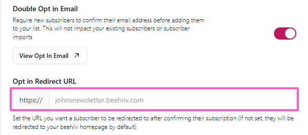 5. (Optional) By default, clicking the confirmation button in the email redirects subscribers to your publication's home page. To send confirmed subscribers to a different destination, enter a URL in the Opt-in Redirect URL field.