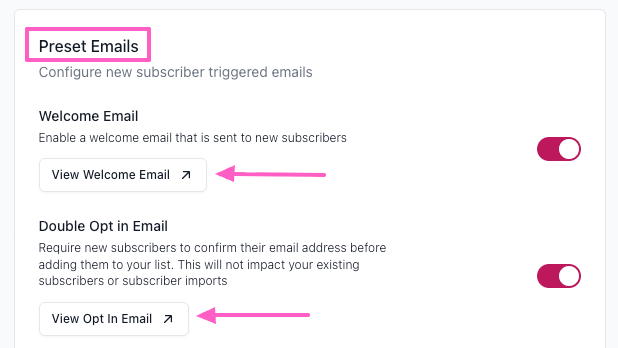 You can customize the subject line, preview text, body content, and confirmation button text of the double opt-in confirmation email and your welcome email from the same place.