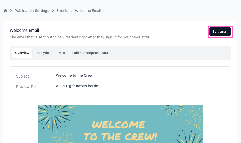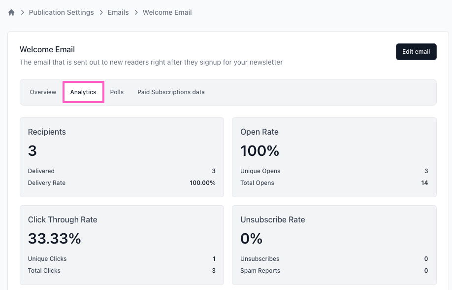 7. You’ll return to the email page where you can use the Analytics tab to monitor the performance of these emails. The Welcome Email also has tabs for Polls and Paid Subscriptions data.