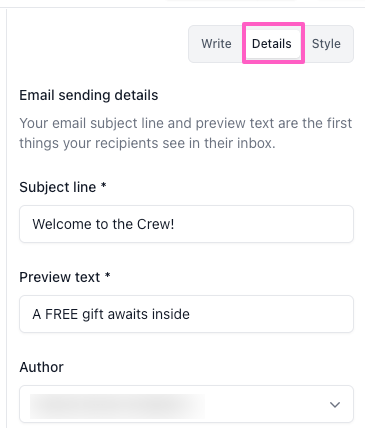1. The Details tab will open on the right where you can update the Subject Line, Preview Text, and Author.