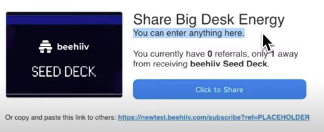 Note that the information you see in the block and what each of your subscribers see will differ depending on how many referrals they have, but each will also include their unique referral link.