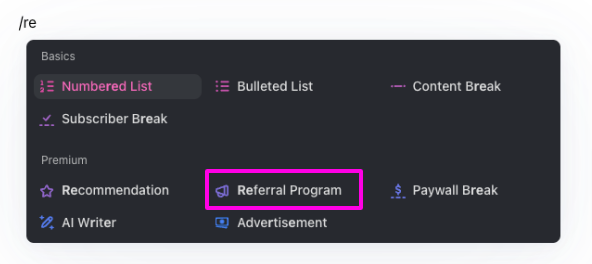 From an open post, start to type /Referral Program to access the block in the editor and place it in your post accordingly. Then be sure to Preview your post to see your Referral Program block designed to your publication settings.