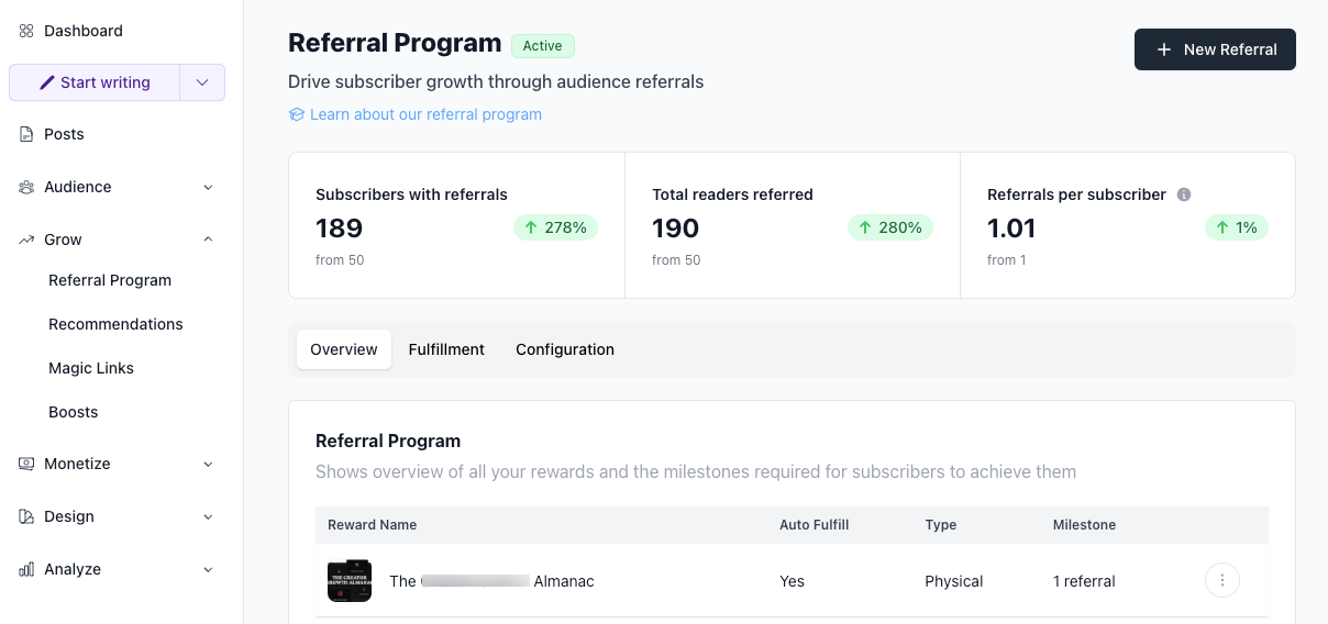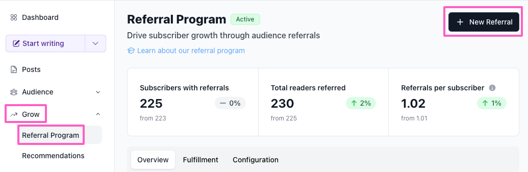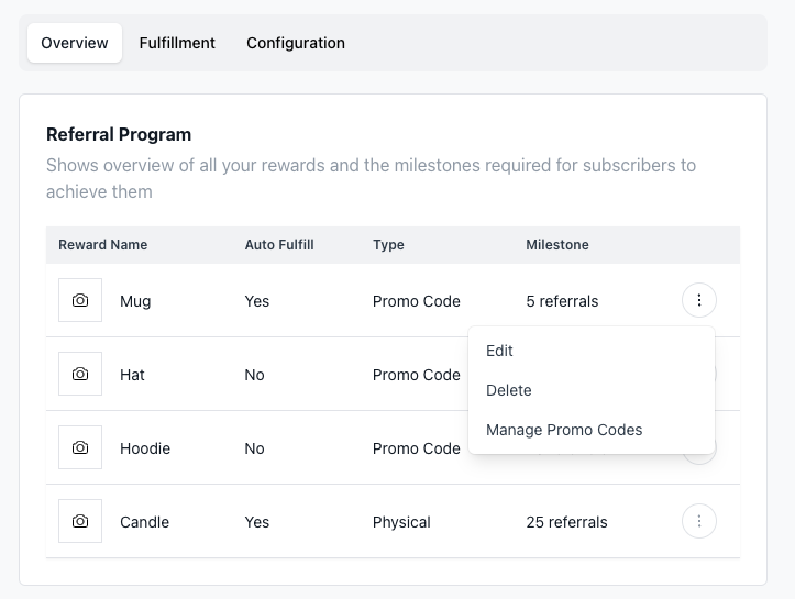 Below the stats on your Referral Program dashboard, you’ll see three tabs: Overview, Fulfillment, and Configuration. Click on each tab for more details about what they offer.
