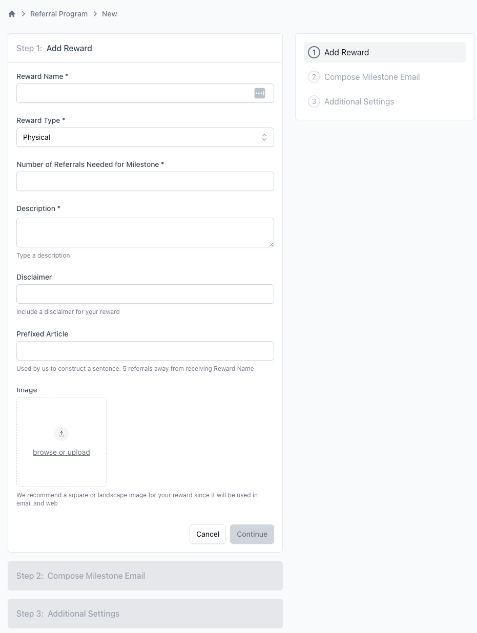- Under Number of Referrals Needed for Milestone (required), specify how many referrals are needed to unlock this reward.