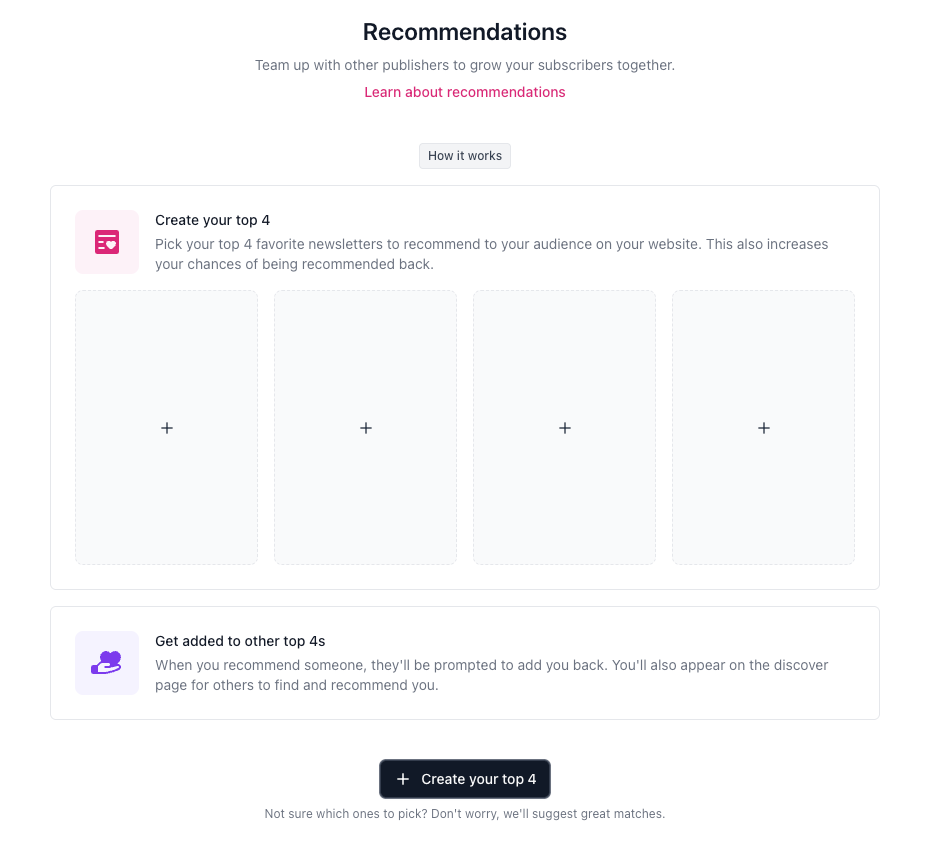 While setting up a Top 4 can accelerate your subscriber growth, it’s completely optional. Keep in mind that even if you don’t display a Top 4, other publications can still choose to recommend you.