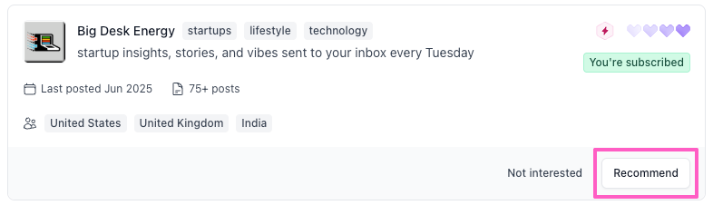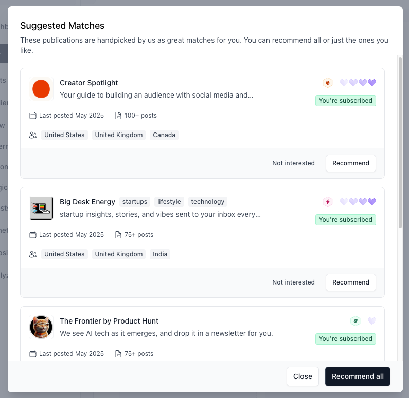 - You’ll see a list of recommended publications based on content similarity and audience overlap.
