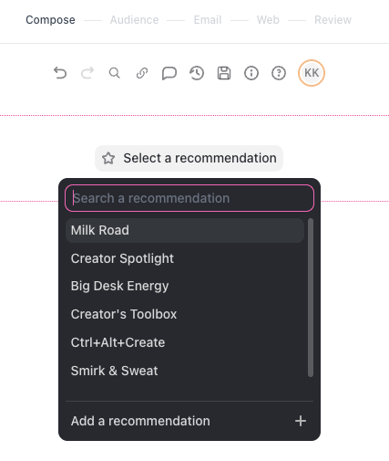- Inside your posts, by typing /recommendation and selecting a publication. You can also insert one from the Add to new post option found in the 3 dots menu of your Recommendations dashboard.