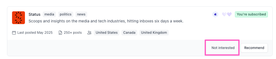 - Or, if you’re not interested in a suggestion, click Not interested and a new publication will appear for you to review.