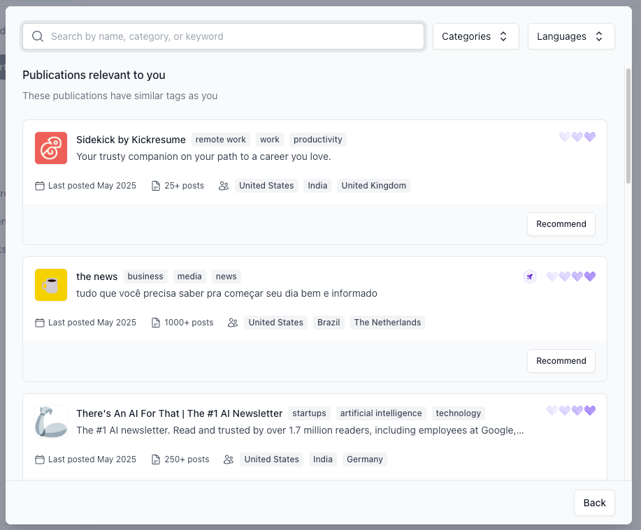 - In the modal that opens, use the Search bar to look up publications by name. Or filter by Categories and Languages to narrow your results. To select a publication, click Recommend. If you’d like to return to your dashboard, click Back.