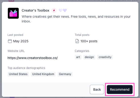 By recommending other newsletters, and being recommended in return, you tap into a powerful growth loop. It’s a smart and remarkably easy way to cross-promote with other newsletters and collaborate with fellow creators to grow your audiences together.