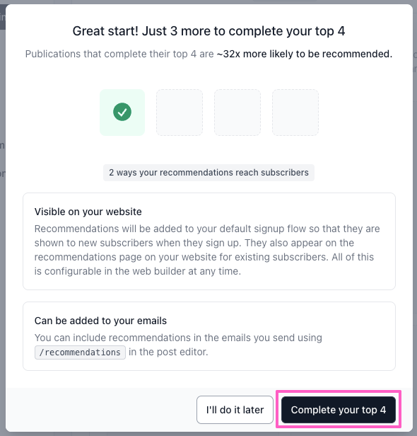 - Recommendations can appear in your signup flow. You can include a Recommendations step in your publication’s signup flow, so new subscribers are introduced to your Top 4 right after subscribing.