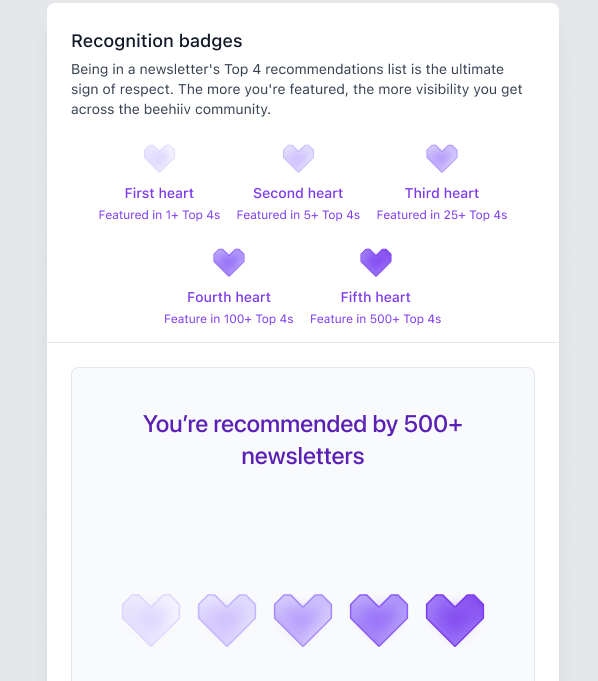 beehiiv now supports up to 4 Recommendations in the Top 4 format. This change helps streamline the experience for subscribers. While it’s no longer possible to add more than 4, any Boosts you’re running will still appear above your Top 4 in the signup flow.