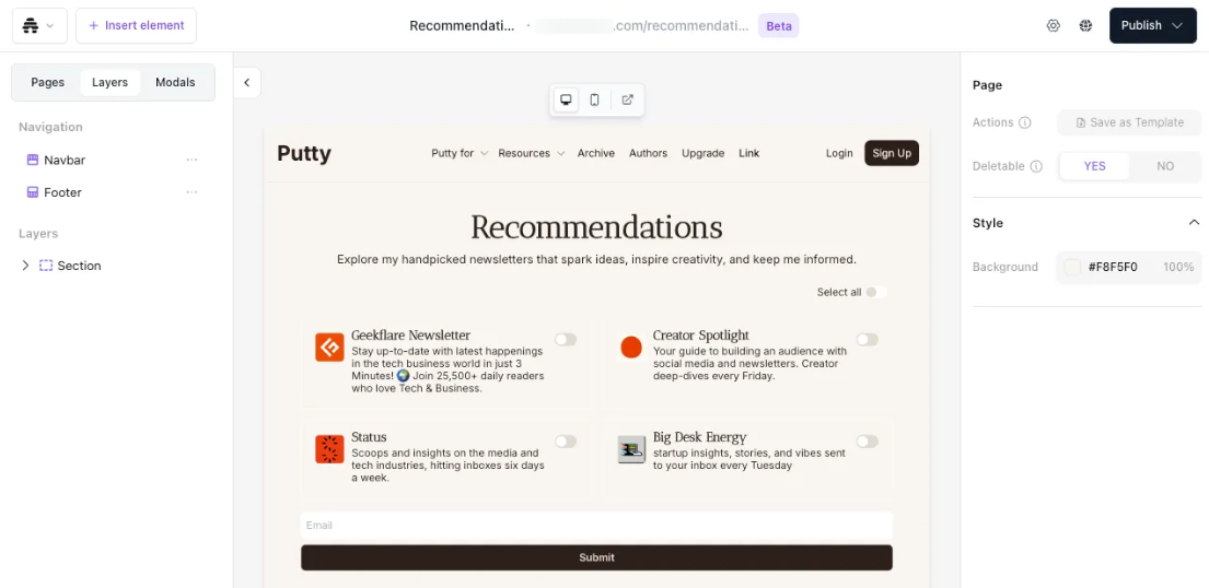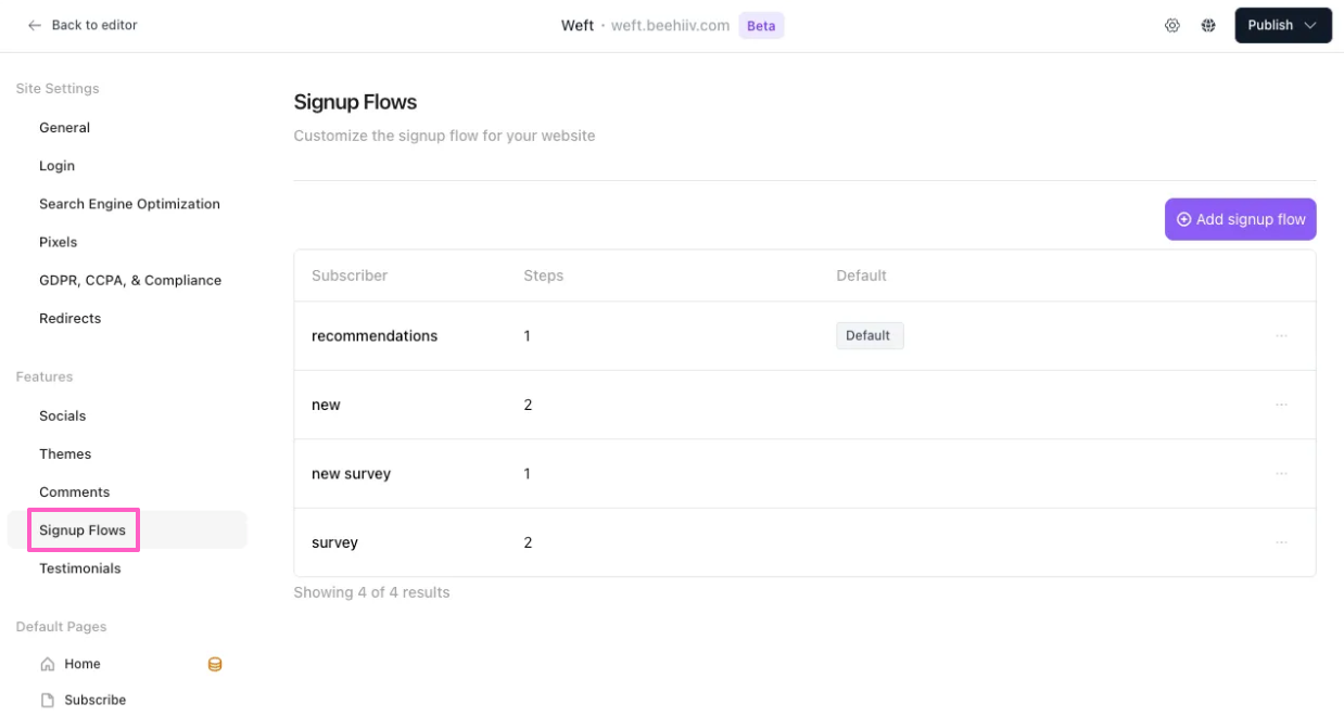 From your Recommendations dashboard, click on Manage signup flows to access the website builder for your publication. Your setup may vary depending on which version you're using: