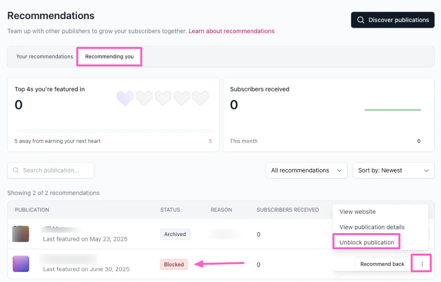 Click the 3 dots menu and select from Add to my top 4, View publication details, or View website. Use the Search bar to look up publications by name, or sort by Newest, Oldest and Subscribers referred to narrow your results.
