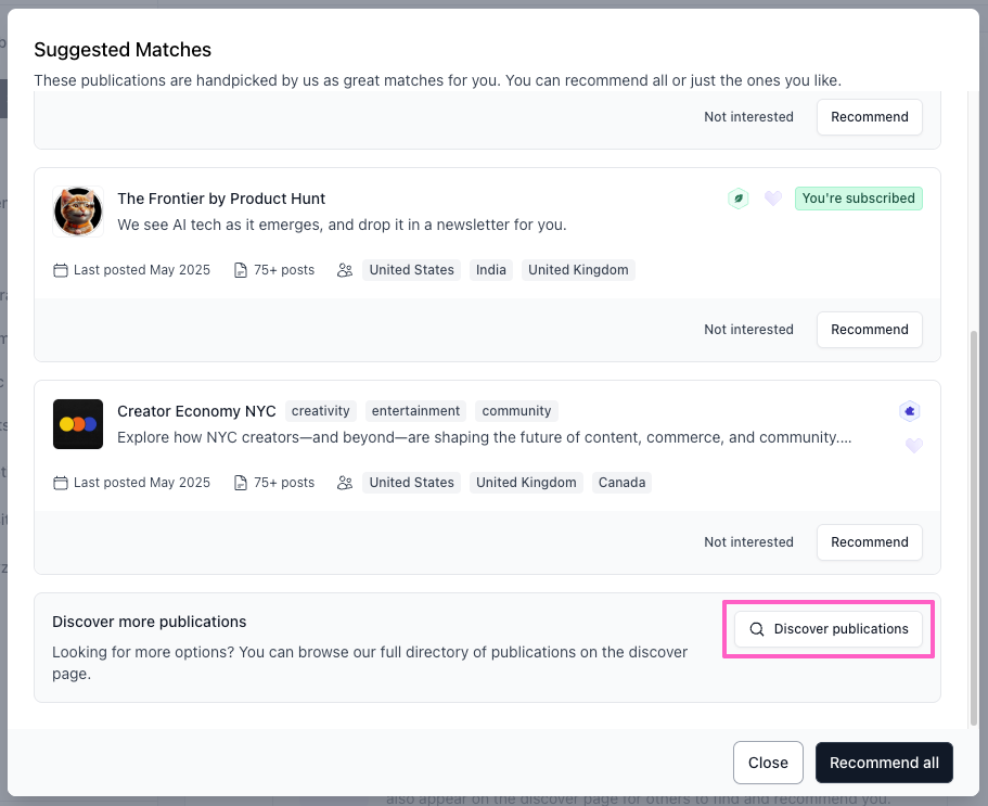 - You’ll see a list of recommended publications based on content similarity and audience overlap.