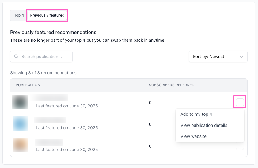 Click the 3 dots menu and select from Add to my top 4, View publication details, or View website. Use the Search bar to look up publications by name, or sort by Newest, Oldest and Subscribers referred to narrow your results.