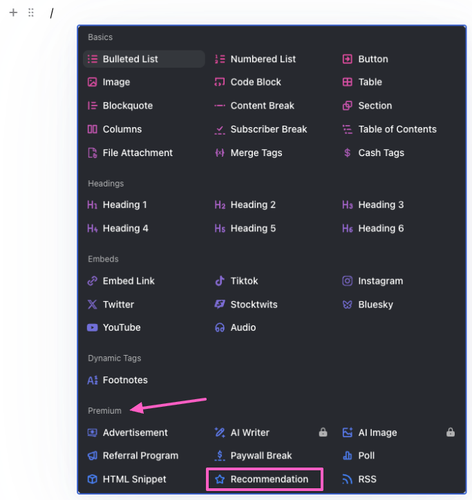 - The Post Builder will open on the Compose page. Access the post editor by typing /. Under Premium, select Recommendation.