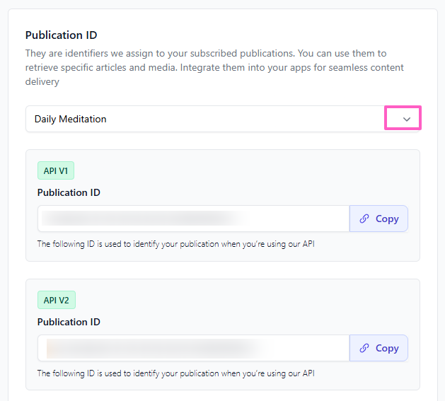 Click the arrows icon to select the publication for which you need the ID. - Once selected, you’ll see the Publication ID displayed, compatible with either API V1 or API V2. Click the Copy icon to save the ID for use in your API requests.