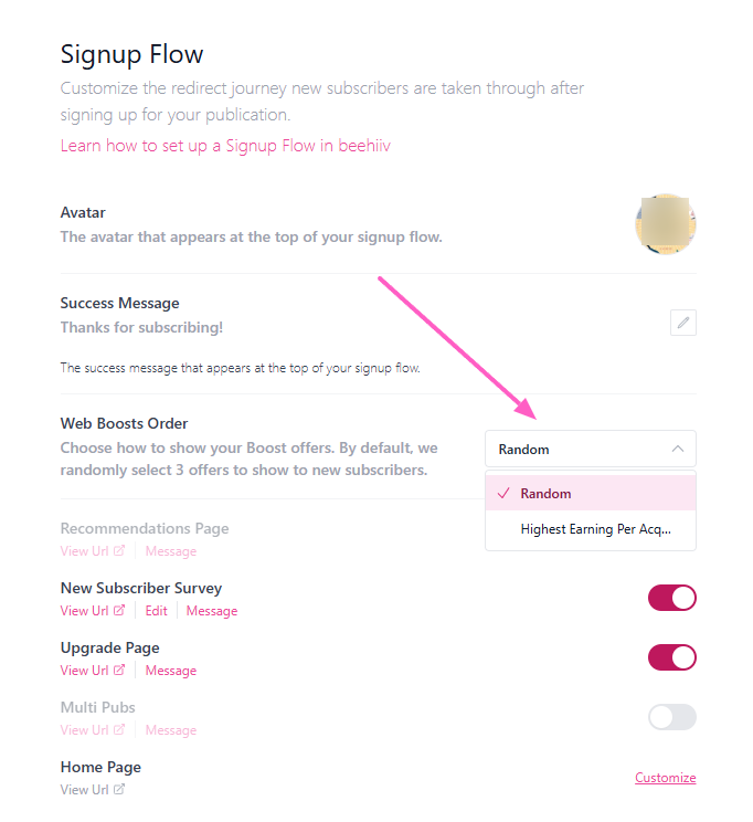Access the Website Builder and select the Settings tab, then click on Signup Flow in the left panel. In the Web Boost Order field, you have the following options: