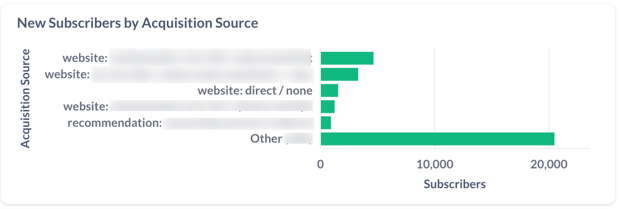 To the right of your New Subscribers chart, you’ll see a breakdown of New Subscribers by Acquisition Source. Each source is listed by type (such as website, recommendation, and so on).
