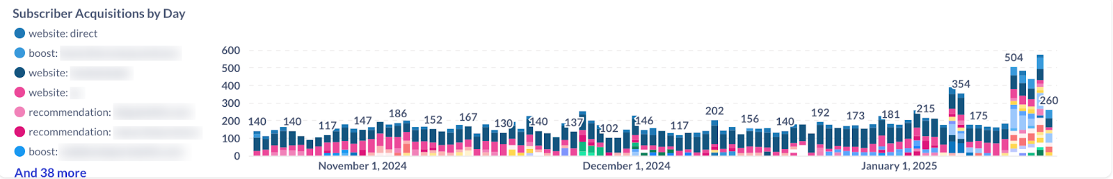 Under your new subscribers info, you’ll see your Subscriber Acquisitions by Day chart. Each acquisition source is listed by type (website, recommendation, boost, and so on) and is color-coded to help you visualize where your subscribers are coming from.