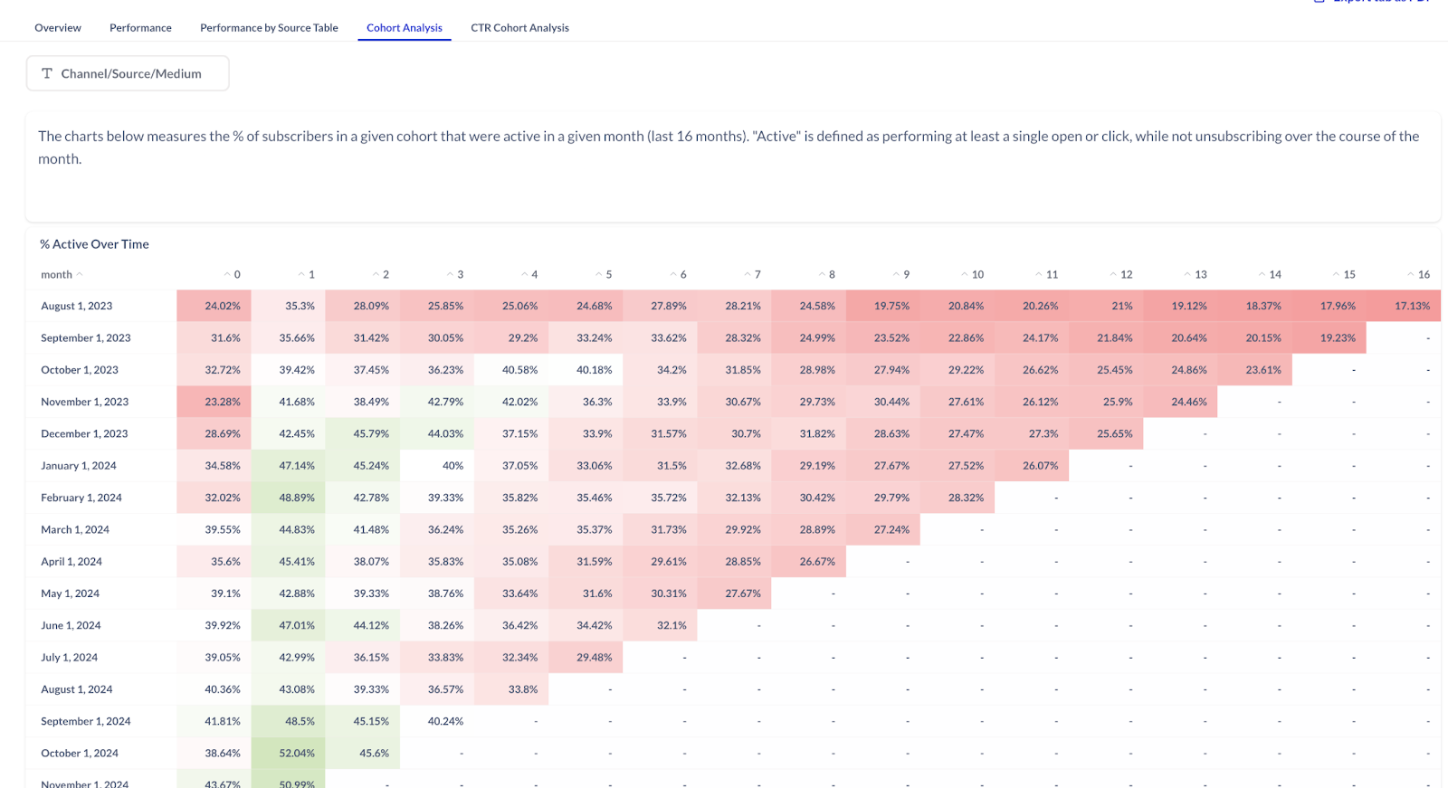 The Cohort Analysis tab displays a chart that measures the percentage in a given cohort that were active in a given month, for the past 16 months. ‘Active’ is defined as performing at least a single open or click while not unsubscribing during the course of the month, with the earliest date displayed at the top.