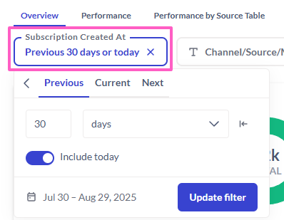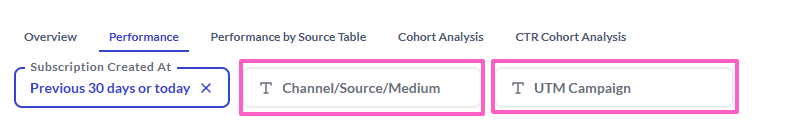 Like the Overview tab, the Performance tab is also set to the previous 30 days (or current date) by default. You can adjust this timeframe by clicking on the Subscription Created At button, and further refine your results by adjusting the Channel/Source/Medium or UTM Campaign.