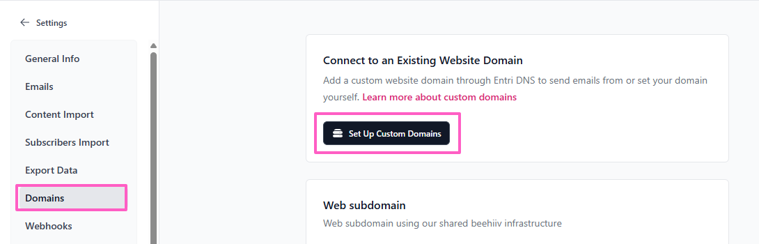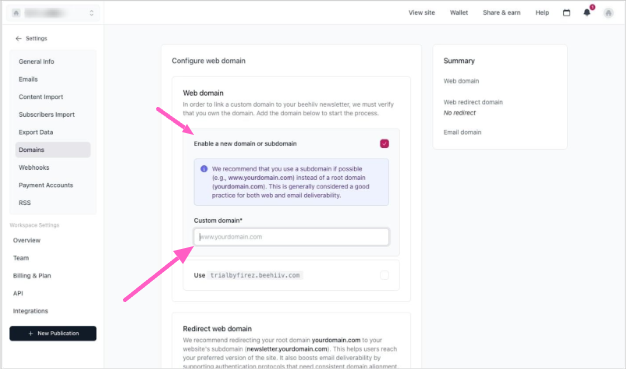 - In the Configure web domain section, you'll see your built-in beehiiv subdomain in the Use field. To switch to a custom domain, go to Enable a new domain or subdomain and enter your custom domain in the field provided.