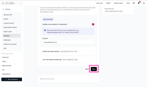 If you use your domain for regular email, we recommend you select Enable a new domain or subdomain and use a subdomain to ensure healthy deliverability.