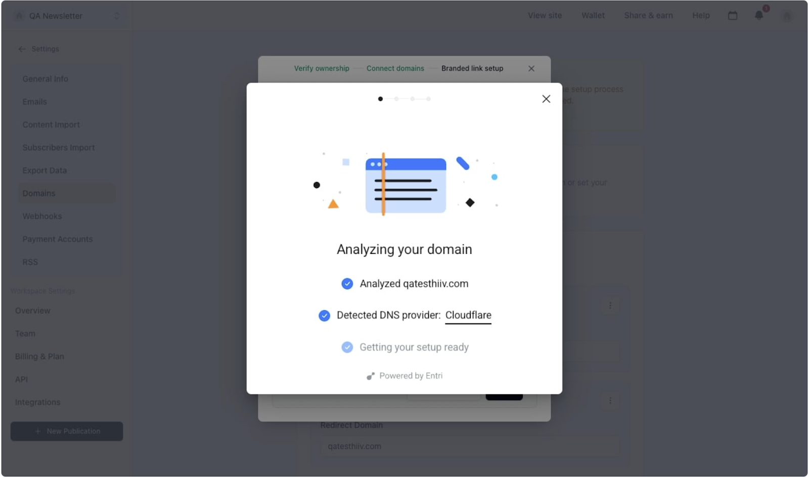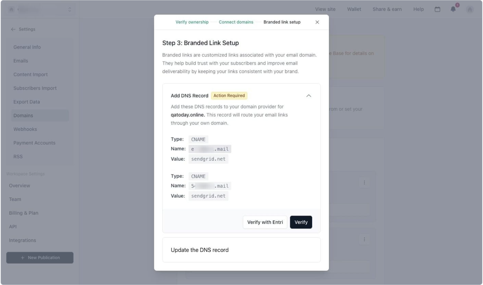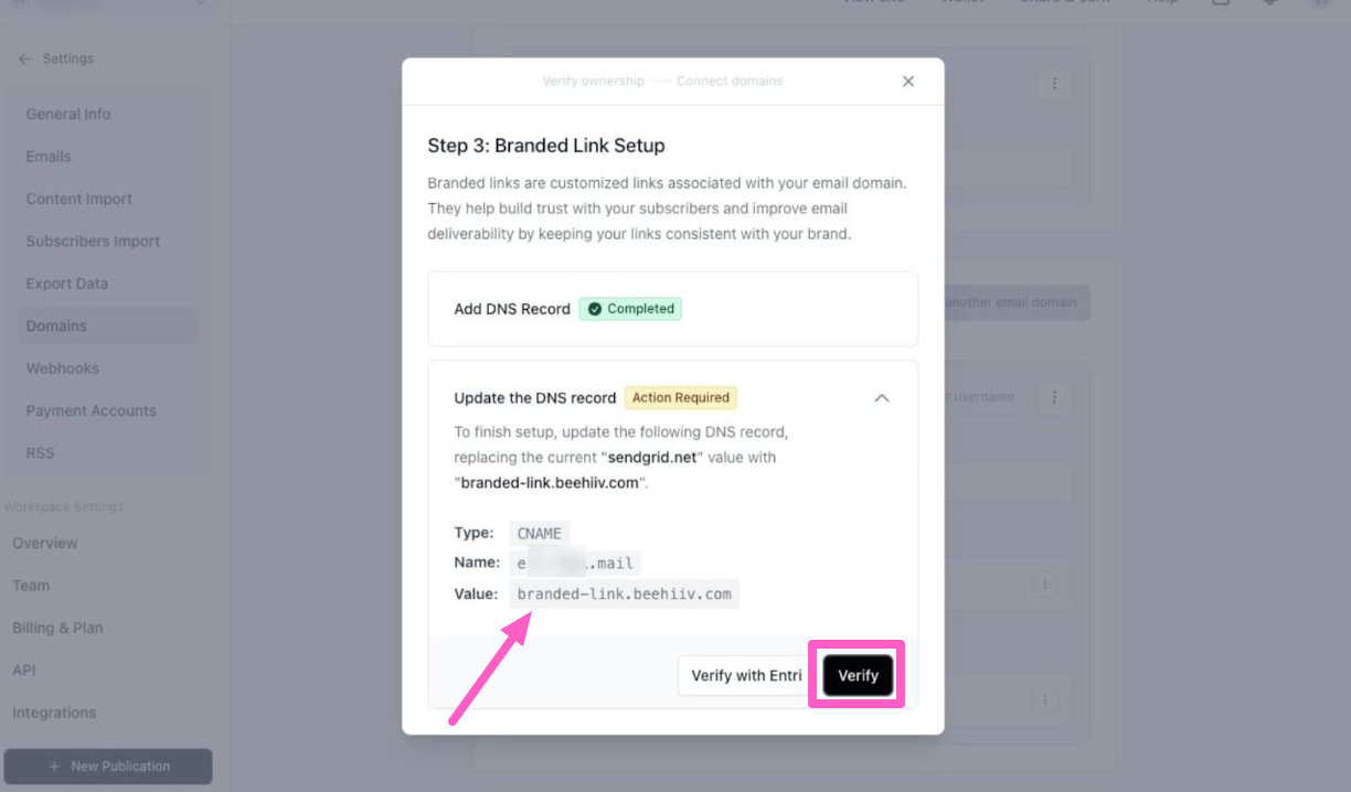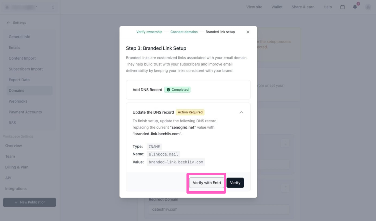 - Branded Links setup is in two parts, the first of which you’ve already completed. In the popup, click on the Verify with Entri button to begin branded link setup.