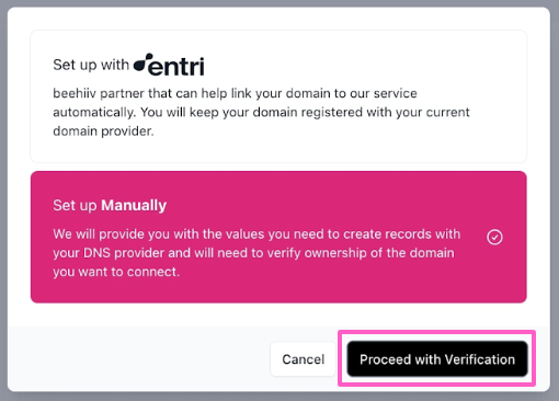 - From the popup, select the Set up Manually option and click Proceed with Verification to view and copy your personalized DNS records.