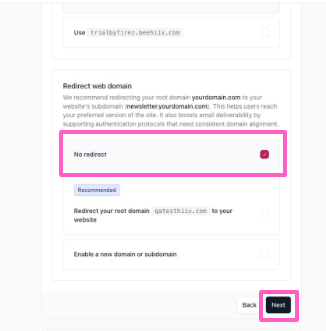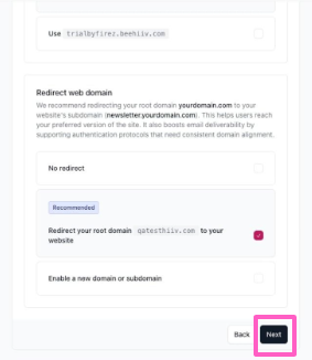 - Recommended: If you used a subdomain (like newsletter.domain.com) as your web domain, select Redirect your root domain to your website, then click Next.