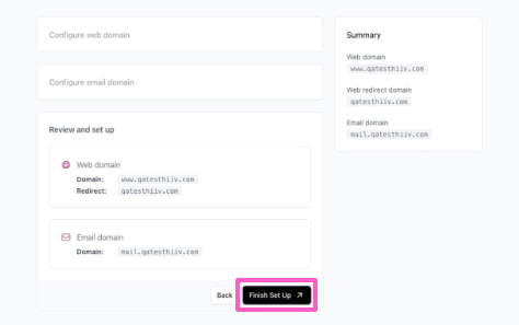 - In the Review and set up section, you’ll see a Summary of your selections. Double-check that everything looks correct, then click Finish Set Up to generate your DNS records.