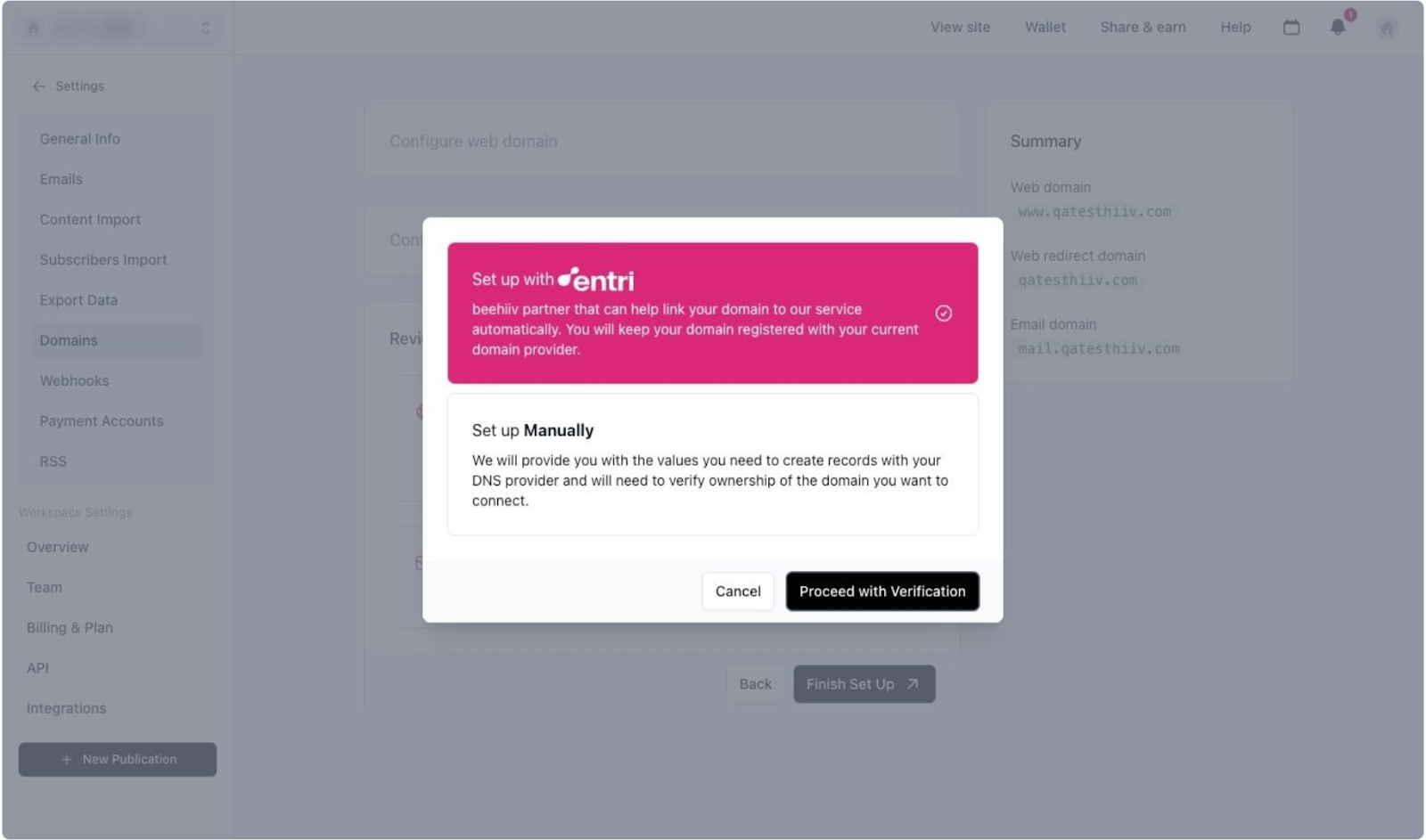 - From the popup, select the Set up with Entri option and click Proceed with Verification to view and copy your personalized DNS records.