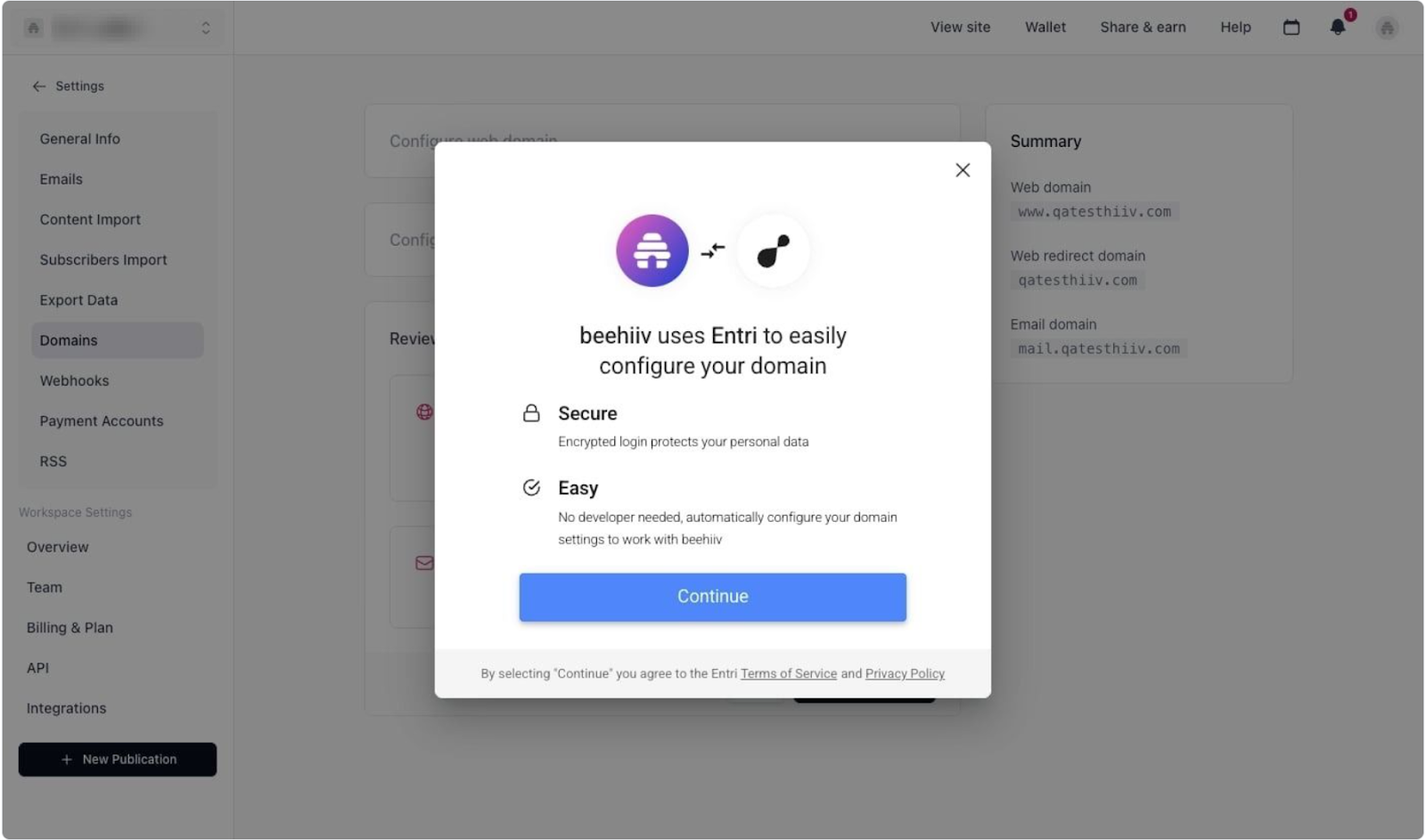 - A confirmation popup will appear. By choosing this option, you authorize Entri to configure DNS records with your domain provider on your behalf. Click Continue to proceed.
