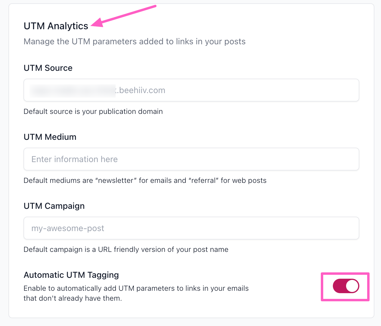 If you prefer not to track UTM parameters, you can disable this feature by toggling off the Automatic UTM Tagging option. By default, this setting is turned on.